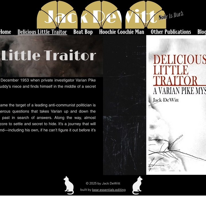 Because DeWitt's novels are very inspired by noir and take place in the early 50s, I wanted to work in the noir aesthetic into the design. The deep blacks and light grays create the kind of contrast you'd see in a Marlowe film; the smoke, especially in the text mask for NOIR IS DARK in the main page, allude to the chain smoking of the era and also to the misty nights in the seedy cities. DeWitt's name is overlaid on some shapes that reminded me of art deco windows in a New York skyscraper—you're looking through windows to see DeWitt's name the same way the characters look through a window to see a murder most foul.
